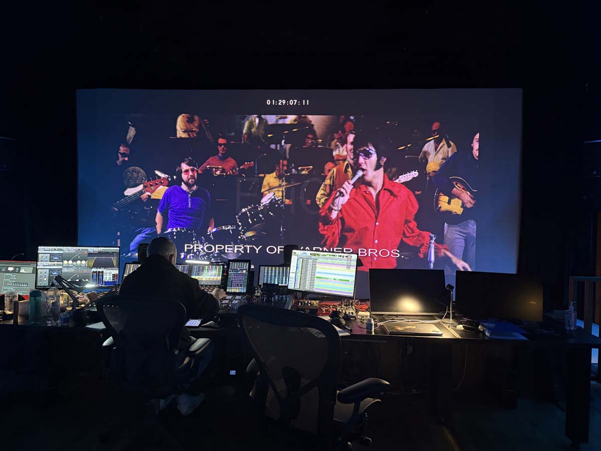 We almost completely drop out the sound. Yeah. There’s a bit of atmospheric echo just as you see Elvis walking towards the stage. And we knew we were gonna come in hard when Elvis is backstage and the curtain’s going back and the drums kick in and we wanted to create this sense of quiet, then hit you with something really loud and exciting. So we did create these moments where you’re telling the audience something’s gonna happen soon. “This is quiet, but it’s not gonna stay quiet very long.”