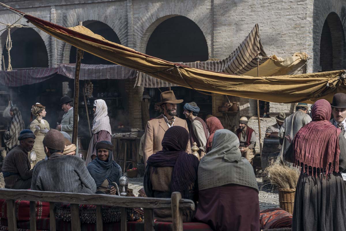 Another one I wanted to talk about was a little bit of time displacement. There’s been time displacement from the very beginning. I noticed jump cuts at the river and when Mycroft is picking out his cane at Baker Street before the title sequence. So, in the final episode Edie is on the balcony with Silas. As they are in mid-conversation, you edit to her walking towards the Holmes family - like a flash-forward. Talk to me about the reason for that. What was the benefit of that? What was the value?