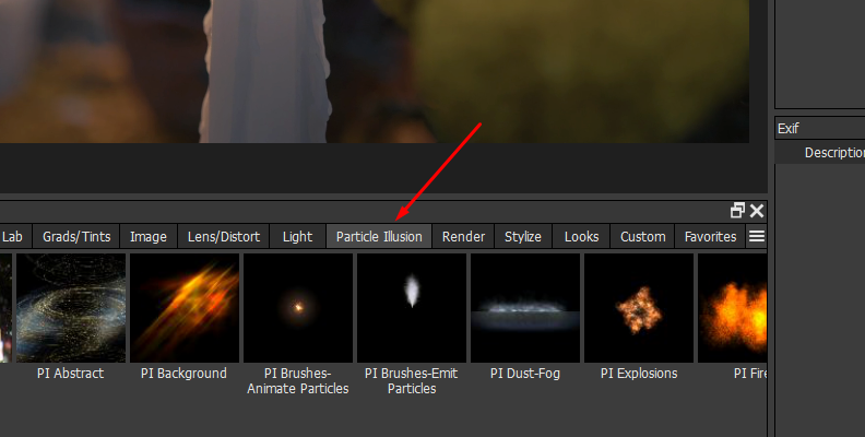 Select the Current Layer in the Layer panel and navigate to the filter library in the panel below the viewer. Click the Particle Illusion tab to access the particles category with several different effects.