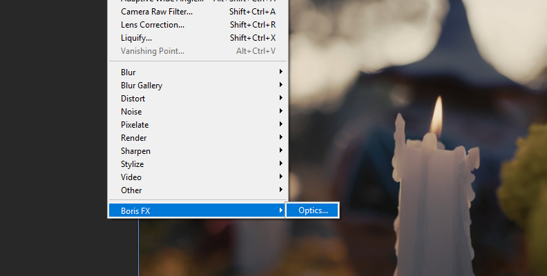 With the smart object layer selected, go to File > Boris FX > Optics and wait for the Optics user interface to launch.