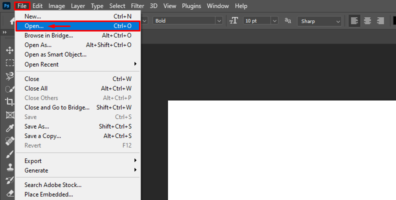 So, load Photoshop and import an image, using the File -> Open navigation as shown in the image below.