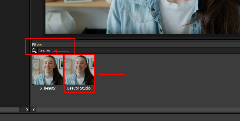Using the search bar under the "Filters" section, find the Beauty Studio effect and click on it.