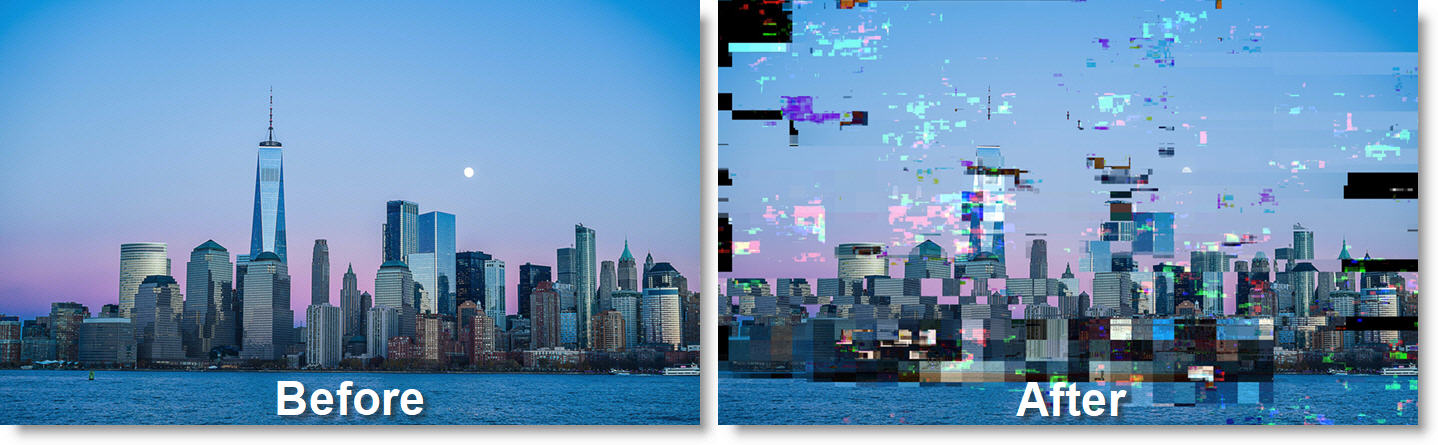 Simulates bad digital TV transmission with many options, including freeze-frames, shifting and flowing blocks, various kinds of blocky noise, and pixelization. Can give looks similar to MPEG stream errors, digital dropouts, and satellite feed data corruption.