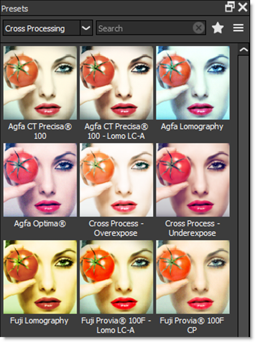 The Presets window allows you to select from a set of pre-defined presets. Presets are available for most filters so that you can easily click through the various choices.