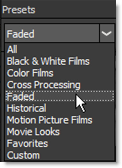 Clicking once on a preset modifies the image in the Viewer. As you click on different presets, the image in the Viewer will update. This allows you to quickly try out several different presets.